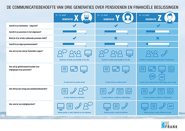 Een onderwerp als pensioen is geen onderwerp waar de jongere generatie zich graag mee bezighoudt. Des te belangrijker is het dat de communicatiemiddelen aansluiten bij deze generatie. Uit het onderzoek blijkt dat moderne communicatiemiddelen (waaronder WhatsApp, een chatbot en online portal) onmisbaar zijn bij het doorvoeren van wijzigingen aan je pensioen of bij het stellen van een vraag aan je pensioenuitvoerder. Jan Hein Rhebergen, commercieel directeur van BeFrank: “Het is ons doel om pensioencommunicatie zo duidelijk mogelijk te maken. De voorkeuren voor bepaalde communicatiemiddelen bij het nemen van financiële beslissingen zijn van belang voor onze eigen manier van communiceren. Al onze activiteiten vinden online plaats. Wijzigingen in het pensioen kunnen dan ook eenvoudig via onze app worden doorgegeven en we zetten WhatsApp en een chatbot in als communicatiemiddel voor vragen.”